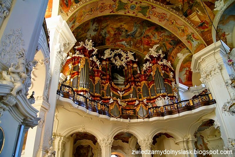 Wnętrze bazyliki krzeszowskiej. Na wstępie muszę przeprosić opiekunów sanktuarium, ponieważ złamałem zakaz fotografowania, ale z drugiej strony, gdybym nie zrobił tych zdjęć, to chyba popełniłbym grzech zaniechania (bo jak można nie pokazać szerszej publiczności takich cudów?).